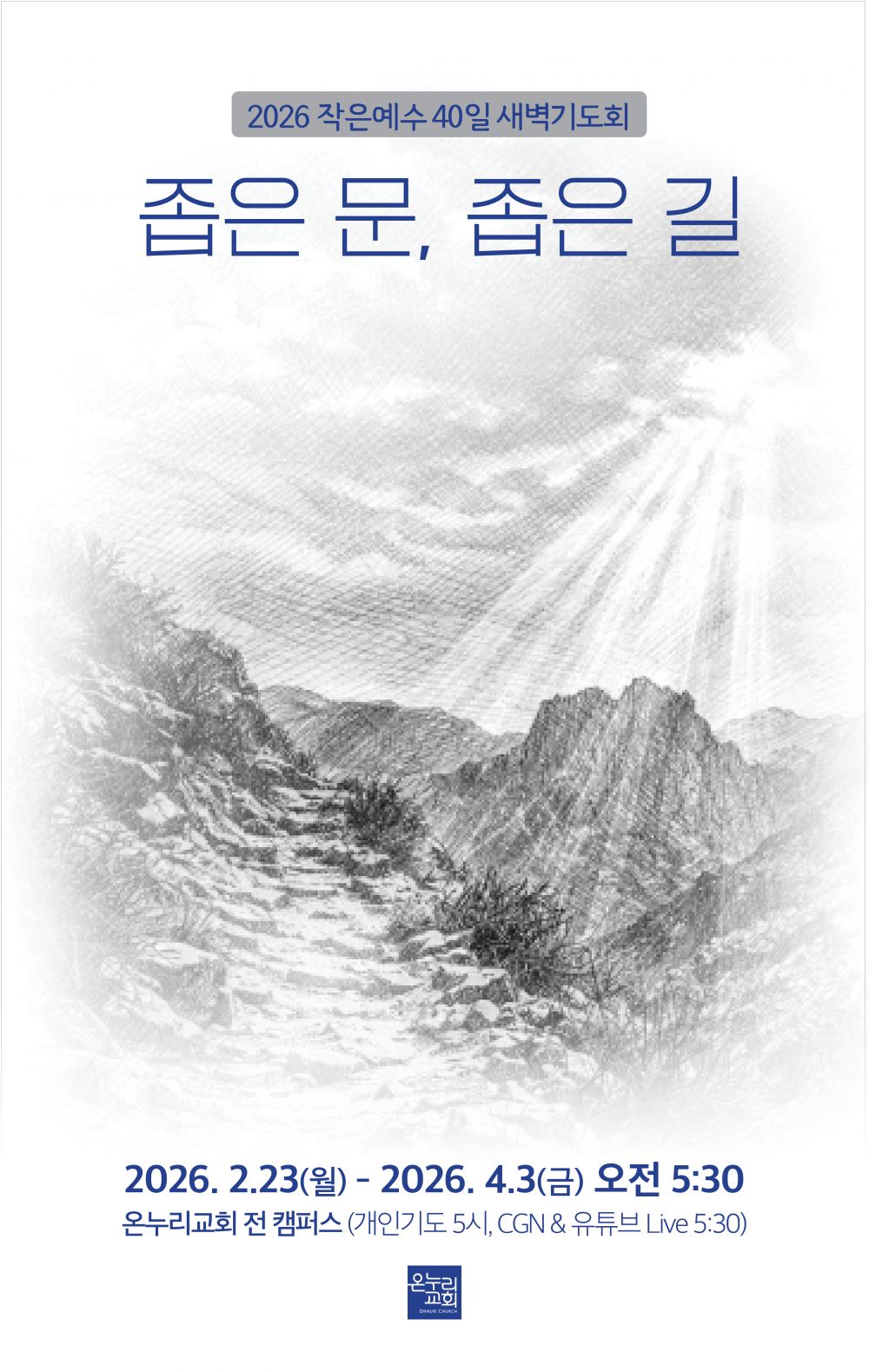 [News] 좁은 문, 좁은 길 좁은 문, 좁은 길 2월 23일~4월 3일‘작은예수 40일 새벽기도회’ 국내 온누리교회 모든 캠퍼스 본당 오전 5시 30분 2026 ‘ 작은예수 40일 새벽기도회’ 가 2월 23일(월)부터 4월 3일(금)까지 이어진다. 매주 월요일부터 금요일까지 오전 5시 30분 ‘좁은 문, 좁은 길’ 을 주제로 국내 온누리교회 모든 캠퍼스 본당에서 진행된다. 온누리교회 유튜브 채널과 CGN TV 채널에서 작은예수 40일 새벽기도회 실황을 시청할 수 있다. 2026 작은예수 40일 새벽기도회는 주별로 산상수훈의 핵심 메시지를 따라 진행된다. 1주 차(2/23~27) ‘복의 길’ , 2주 차(3/2~6) ‘의의 길’ , 3주 차(3/9~13) ‘ 온전함의 길’ , 4주 차(3/16~20) ‘기도의 길’ , 5주 차(3/23~27) ‘그 나라의 길’ , 6주 차(3/30~4/3) ‘십자가의 길’이다. 이재훈 위임목사가 캠퍼스를 순회하며 해당 캠퍼스 부목사와 함께 설교한다. 고난주간에는 해외비전교회 담당 목사들이 설교한다. 매주 금요일에는 대학청년부와 차세대가 예배를 주관한다. 고난주간에는 온누리교회 성도들 모두가 십자가 목걸이를 걸고, 예배 전후 침묵으로 기도한다. 교회 로비에 설치된 ‘ 회개의 십자가’ 에 기도제목과 자신의 죄를 적은 종이를 못으로 박고 회개하는 의식도 한다. / 박지혜 기자 wisdom7@onnuri.org ‘보시기에 좋았더라’(부제: 자기 부인의 제자도) 2월 18일~4월 5일‘2026 창조질서회복 캠페인’ ‘2026 창조질서회복 캠페인’ 을 실시한다. ‘ 보시기에 좋았더라’(부제: 자기 부인의 제자도)를 주제로 2월 18일(재의 수요일)부터 4월 5일(부활주일)까지 이어진다. 성인공동체와 대학청년부는 1주차(2/18~21) ‘ 디지털 디톡스: 내 손안의 우상을 내려놓다’ , 2주차(2/23~28) ‘ 건강한 식습관: 내 몸은 하나님의 거룩한 성전’ , 3주차(3/2~7) ‘ 생태 회복: 소유보다 나눔, 채움보다 비움’ , 4주차(3/9~14) ‘ 바른 언어 생활: 죽이고 살리는 혀의 권세’ , 5주차(3/16~21) ‘ 절제와 성실: 운이 아닌 은혜로 사는 삶’ , 6주차(3/23~28) ‘ 겸손과 순종: 나 중심에서 하나님 중심으로’ , 7주차(3/30~4/5) ‘ 나를 따르라: 부활의 증인으로’ 를 주제로 캠페인을 한다. 자기 전 종이 성경책 읽기, 과식 피하기, 대중교통 이용하기, 남을 비난하거나 험담하는 자리에 끼지 않기, 주식∙코인 차트 확인 등 과도한 몰입 멈추기, 나를 위한 지출 줄여 이웃 구제금 마련하기 등을 실천한다. 차세대는 ‘ 하나님이 만드신 세상 회복하기’ 를 주제로 1주차 ‘ 디지털’ , 2주차 ‘ 식습관’ , 3주차 ‘ 생태’ , 4주차 ‘ 언어’ , 5주차 ‘ 디지털 미디어’ , 6주차 ‘ 정체성’ , 7주차 ‘ 겸손, 순종’ 에 맞춰 실천 사항을 행한다. 구체적인 실천 사항은 SNS 앱 알림 모두 끄기, 탄산음료 대신 물 마시기, 길에 떨어진 쓰레기 3개 줍기, 긍정적인 말하기, 영상 보기 전 성경 읽기 등이다. 문의: 02-3215-3434 / 홍하영 기자 hha0@onnuri.org 2026 이주민 설 집회 개최 2월 14~21일 이주민 720여 명 참석 온누리M미션이 2026 이주민 설 집회를 개최한다. 2월 14일(토)부터 21일(토)까지 각 언어권별(총 29개)로 연합 수련회와 아웃팅(Outing, 나들이)을 한다. 몽골, 네팔, 캄보디아, 베트남 등지에서온이주민720여명이참석한다. 각 센터 몽골어 예배는 팀 수양관에서 연합 수련회를 한다. 안산M센터 우즈벡(15일), 열방YER(15~16일), 필리핀(15~16일), 태국(16~17일), 베트남(16~18일)공동체는 안산M센터에서 설 집회를 연다. 남양주M센터 인도(14일), 캄보디아(15일), 방글라데시(17일)공동체는 남양주M센터에서 예배를 드린다. 남양주 네팔공동체는 2월 14~15일 Acts29 비전빌리지에서 수련회를 한다. 김포M센터 차세대는 2월 14일 이주민 설 집회를 한다. 2월 16일 안디옥인도네시아교회는 안산M센터에서 연합 집회를 하고, 화성M센터 네팔 공동체는 안산지역 네팔연합집회에참석한다. 아웃팅도 한다. 서빙고 아랍어예배 충남(15일), 네팔어예배 군포 쉘터(17일), 안산M센터 네팔어예배 대부도 펜션(14~15일), 군산M센터 열방∙라오스예배 전주 한옥마을(17~18일), 화성M센터 캄보디아예배 서울(17일)에서 아웃팅을 한다. 인천 이주민 차세대와 아프간 청소년들은 SNS청년부와 함께 서울랜드(21일) 나들이를 한다. 문의: 02-3215-3730 / 홍하영 기자 온누리교회 ‘공동체성경읽기 앱’ 출시 공동체성경읽기 앱 ‘온누리 성경읽기’를 출시했다. 성경읽기 영상과 진도 점검, 알림 기능을 제공한다. 앱을 실행하면 그날 본문에 해당하는 ‘성경읽기 영상’이 제공된다. ‘통독 캘린더’로 성경읽기 진도를 점검할 수 있고, ‘알림 기능’을 설정하면 매일 정해진 시간에 말씀 묵상습관을 기를 수 있다. 온누리교회는 지난달 31일부터 매주 토요주일과 일요주일 예배에서 ‘공동체성경읽기’를 하고 있다. 성경 낭독의 전통을 회복하고, 성도들이 말씀에 대한 경외심을 높이 며, 하나님과 더욱 친밀하게 동행하도록 돕기 위함이다. / 홍하영 기자 강동온누리교회 창립 18주년 감사예배 강동온누리교회 창립 18주년 감사예배를 드린다. 2월 21일(토) 오전 10시 30분, 22일(일) 오전 9시, 11시 30분 강동온누리교회 12층 본당에서 진행된다. 주찬양찬양사역팀과 주기쁨찬양사역팀이 특순한다. 강동온누리교회는